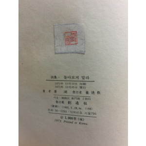 돌아보지 말라 (장호시집,1973초판,저자증정본)