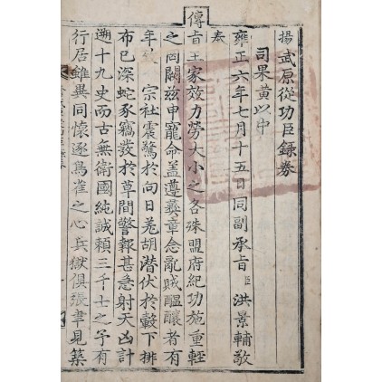 무신자본으로 황이중이 받은 내사본 [양무원종공신녹권]이다. 英祖4년(1728)에 일어난 李麟佐의 亂(戊申亂)을 다스리는데 공을 세운 사람들에게 내린 錄券이다. 당시 정권에서 배제된 소론 강경파와 남인 일부가 경종의 죽음에 영조와 노론이 관계되었다고 주장하면서 일으킨 내전이다. 난이 진압된 후 7월에 揚武錄勳都監을 설치하고 난의 진압에 공을 세운 사람을 선정하여 녹권을 내렸다. 녹권의 서두에는 大提學 尹淳이 찬한 [揚武討逆頒敎文]이 실려 있는데, 이는 사건의 개요와 녹훈의 의의를 밝힌 것이다. 이어서 공신의 명단을 수록한 傳旨와 등급별 포상규정을 담은 傳旨가 실려 있다. 포상규정은 본인에 대한 加資와 자손의 承蔭, 후손에 대한 사면, 부모에 대한 封爵 등과 기타 부가적인 혜택, 公私賤의 免賤 등의 내용을 규정하였다. 말미에는 揚武錄勳都監의 堂上 郎廳 監校郎廳監造官 등 관계자를 수록하였다.