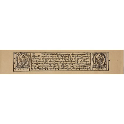 티베트어로 된 불교 경전의 한 장으로, 전통적인 목판 인쇄 방식으로 제작된 것이다. 황갈색의 얇은 종이에 검은 먹으로 인쇄되었으며 판심 양쪽에는 부처님 좌상이 정교하게 새겨져 있다. 본문은 티베트 문체인 우첸(Uchen)체로 쓰였고, 일부 구절에는 산스크리트 음역이 섞여 있어 불설 또는 보리심 관련 경전으로 추정된다.