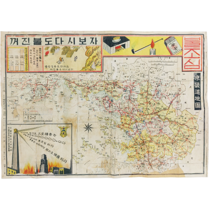 중앙에는 ‘경기도 지도’가 있고, 좌측 상단에는 ‘해방후 경기도 관내 각 시별 화재통계’를 보여주는 막대그래프가 있다. 우측 옆으로는 ‘赤拘와 火魔는 당신의 틈을 엿본다. 消火에 애쓰지 말고 防火에 힘쓰자’, ‘急한 길은 도라가고 꺼진 불은 다시보라’는 표어가 있다. 하단에는 경찰에서 추산한 전년도 피해액과 불조심 구호가 있다. 경북 대구의 ‘朝鮮案內社’에서 발행하였다.