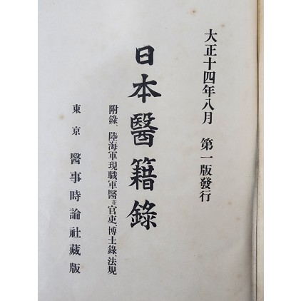 의학교, 교수 연구자 등 일본 전체는 물론 조선의 의원과 이름 사진과, 경성의 개인병원분포 등이 수록되어 있다. 附錄으로 陸海軍現職軍醫竝官吏, 博士錄, 法規가 있다. 상태는 매우 양호하다.