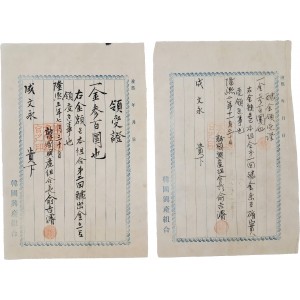 한국흥산조합 조합장 유길준(兪吉濬, 1856~1914)이 성문영(成文永, 1870~1947)에게 갹금(醵金, 갹출하여 낸 돈)을 받고 써준 1908년, 1909년의 친필 영수증이다.