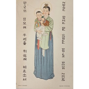 성모는 녹의홍상과 비녀를 갖춘 전통 복식을, 아기 예수는 오방색 돌복을 입고 있어 서구 성화 속에 한국적 미감을 절묘하게 조화시켰다. 좌우에는 ‘한국의 성모여 우리를 위하여 비르소서’와 ‘Notre Dame de Corée, priez pour nous’ 문구가 병기되어 있다. 이 작품은 식민지 시기 유럽 선교회가 한국 교회를 위해 제작한 초기 성모 도상 인쇄물로, 한국 가톨릭 신앙과 서구 선교 미술이 교차한 시각 선교 미술의 상징적 자료로 평가된다. 하단에는 “Printed in Belgium / Imalit Maredret” 표기가 남아 있다.