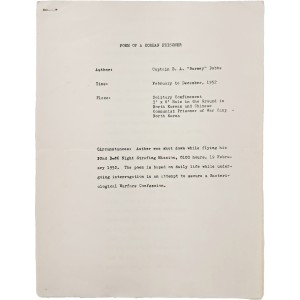 본 자료는 단순한 문학작품의 의미를 넘어, B-26 폭격 임무 중 격추 이후 포로가 된 과정, 심문과정에서의 ‘세균전 자백’ 강요, 반복되는 취조와 협박, 그리고 수용소 내 열악한 생활환경 등을 시 형식으로 기록한 개인 증언문에 가깝다. “Confess, and you’ll go free”와 같은 표현은 당시 심문방식과 압박구조를 직접적으로 보여주는 핵심 구절이다.