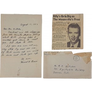 본 자료는 1953년 8월 17일 미국 콜로라도 덴버에서 발송된 개인 서한과, 한국전쟁 포로 송환 관련 신문기사 스크랩이 함께 보존된 자료이다. 발신자는 공통 지인인 ‘Bill(Billy Allen Brown)’의 소식을 전하며, 공산군 포로에서 석방되어 귀환하게 되었음을 알리기 위해 해당 기사를 직접 오려 동봉하였다.