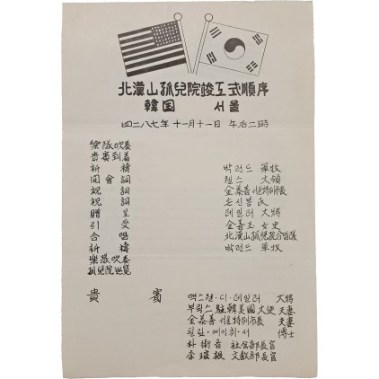 본 자료는 1954년 11월 11일 서울 북한산 고아원(Buk Han San Orphanage) 준공식에서 실제 사용된 공식 프로그램이다. 한국전쟁 직후 전쟁고아 구호와 재건사업의 일환으로 마련된 행사로, 미국 성조기와 태극기가 병기된 도상이 상단에 인쇄되어 한·미 협력의 상징성을 분명히 보여준다.