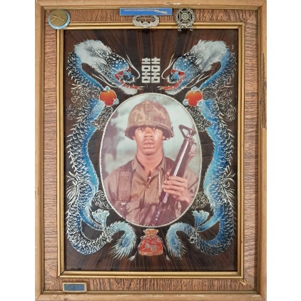 액자 상단에는 미 육군 보병 병과 표식(교차 소총), 사격 숙련 휘장, 항공 관련 휘장 등 실제 미군 군장 장식이 부착되어 있어, 단순 장식화를 넘어 병사의 군 복무 정체성과 전쟁 경험을 시각적으로 강조한다. 이러한 휘장 부착방식은 개인 주문 혹은 기념품 상점에서 맞춤 제작되었을 가능성을 시사한다. 유리, 목재 액자, 실물 금속 휘장, 사진이 하나의 완성체로 보존되어 있으며, 유리 파손 없이 원형이 유지된 점은 잔존 사례 중에서도 상태 면에서 의미가 크다.
