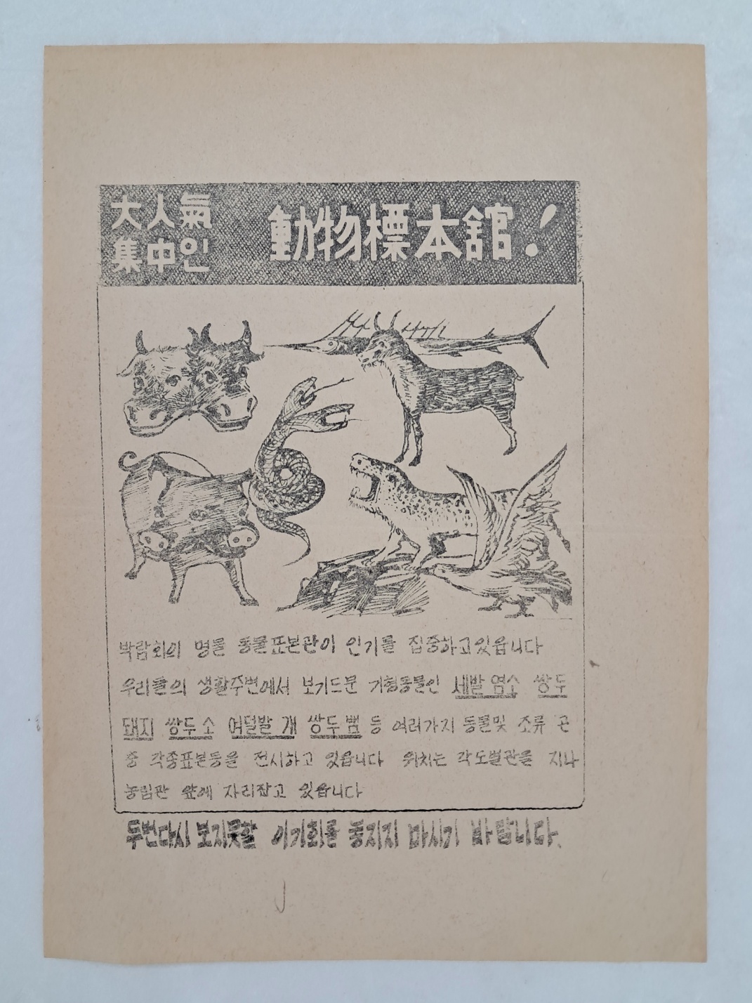 일제강점기 박람회에서 기형동물의 각종표본 등을 전시한 [동물표본관] 전단이다.