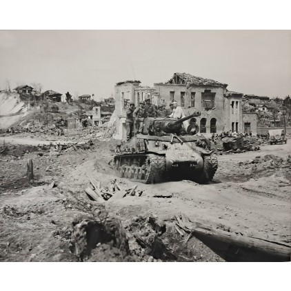 이 사진은 당시 미국의 주요 뉴스 사진 통신사인 ACME PHOTO 소속 스태프 사진작가 버트 애스워스(Bert Ashworth)가 1951년 4월 17일에 촬영한 작품이다. ‘폐허가 된 한국의 춘천 — 38선을 향해 가는 길’이라는 제목 아래, 미군 중형 전차가 병사들을 태운 채 파괴된 춘천 시내를 통과하는 모습과 가벼운 옷차림의 한국인이 마을에서 차량을 안내하는 장면을 담고 있다. 한국전쟁 당시 춘천의 참혹한 실상과 전시 상황을 생생하게 전하는 기록 사진이다.