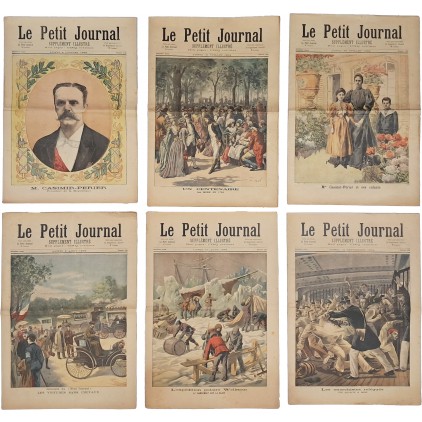본 자료는 1894년 발행된 프랑스 대중 일간지 [Le Petit Journal] 삽화 부록(Supplément illustré) 가운데 동일 연도에 해당하는 총 6권 일괄이다. 해당 세트는 No.190, 191, 192, 194, 197, 199호로 구성되어 있으며, 모두 1894년 여름부터 초가을 사이에 발행된 동시대 연속자료에 해당한다. [Le Petit Journal] 삽화 부록은 19세기 말 프랑스에서 가장 영향력 있던 시사·대중 시각매체로, 당대의 정치·사회·사건·문화·과학·탐험·대중오락을 고급 컬러 석판화로 시각화한 것이 특징이다. 본 세트에는 프랑스 대통령 카시미르-페리에 관련 정치