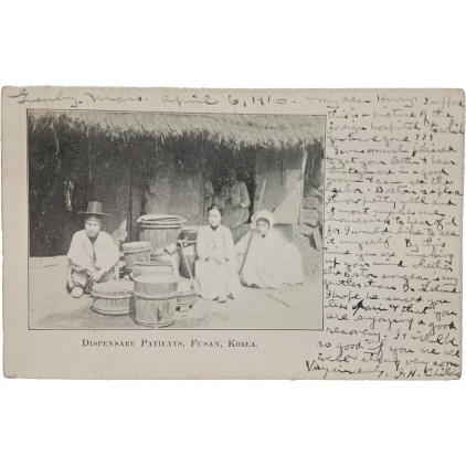 Granby, Mass. April 6, 1916. My dear Harry: I suppose this is a picture of the foreign hospital to which you have gone??? I was much pleased to get your letter & hear that you are in a good room & can see the harbor. Boston is a place I know pretty well and it almost makes me homesick to hear of it for I would like to see it myself. By this time you are making up your mind whether the Boston surgeon is any gentler than Dr. Leland. I hope he caused you less pain & that you are enjoying a good recovery. It will be so good if you are all well & strong very soon. Very sincerely, J.H. Childs.Dispensary Patients, Fusan, Korea.