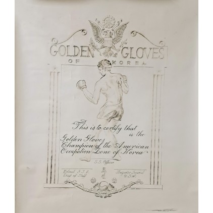 출품물은 미군정기(1945∼1948) 조선에서 개최된 ‘Golden Gloves of Korea’ 복싱 대회의 우승자(Champion)에게 수여된 것으로 보이는 공식 인증서이다. 크기 약 51×61cm에 달하는 초대형 판형으로, 개인에게 수여되는 일반 상장의 범주를 넘는 대회 대표용·전시용 상징물(마스터 보드) 성격을 지닌다.