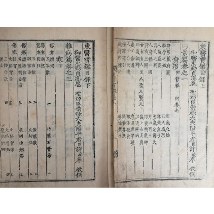 허준 등이 선조의 명을 받들어 중국과 우리나라의 의서들을 모아 집성하고 또 임상의학적 체험을 통한 치료방을 모아 놓은 한의학의 백과전서로 순조14년(1814) 전주에서 간행된 완영 중간본 25책 중 영본 2책이다.