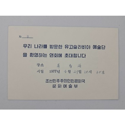 이 초청장은 1977년 4월 27일 평양 옥류관에서 열린 유고슬라비아 예술단 환영 연회 초청장이다표지는 금박 활자로 초대장이라 인쇄된 단색 청색 카드이며내부에는 우리나라를 방문한 유고슬라비아 예술단을 환영하는 연회에 초대합니다라는 문구가 적혀 있다발행처는 조선민주주의인민공화국 문화예술부로 당시 북한의 대외문화 교류를 총괄하던 공식기관이다유고슬라비아는 1970년대 사회주의권 내에서도 비교적 비동맹 중립노선을 유지했기에이 초청장은 북한이 비동맹국과의 문화외교를 강화하던 시기(김일성의 자주노선 강조기)의 구체적 증거이다날짜와 장소가 수기로 기입된 점으로 보아 소수 초청 대상자용 실물 카드로 사용되었음을 알 수 있다. 1970년대 북한의 문화외교·예술외교 활동을 입증하는 1차 사료로서 희귀성과 연구 가치가 높다.