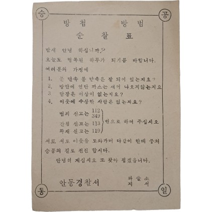 안동경찰서에서 제작한 소형 전단 형태의 방첩·방범 순찰 안내문으로, 가정 내 문단속 상태와 연탄가스 누출 여부, 담장 이상 유무, 수상한 인물 존재 여부 등을 점검 항목으로 제시하고 있다.