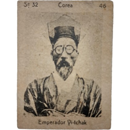 이 소형 카드는 서구 담배카드 계열로, 상단의 “Emperador Yi-tchak” 표기는 이척(李坧), 즉 순종을 가리키는 명칭이지만, 실제 초상은 흥선대원군(이하응) 계열로 보이는 인물상이 사용되어 인물과 명칭이 불일치한 오기(誤記) 사례에 해당한다. 이는 19~20세기 초 서구 인쇄물에서 조선·대한제국 왕실 인물들이 고종·순종·대원군 등으로 혼동되어 소개되던 관행을 그대로 반영한 것으로, 정확한 인물 식별보다는 ‘한국의 황제’라는 상징적 이미지 소비에 초점이 맞춰진 자료이다. 따라서 본 카드는 초상 자체보다도 서구 사회의 대한제국 인식 오류와 정보 전달의 한계를 보여주는 사료적 가치가 크다.