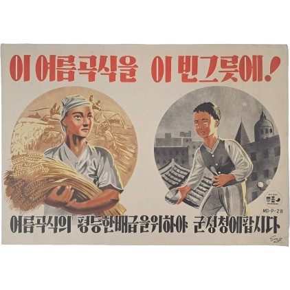 해방직후 식량부족이 극심해지자 미군정은 1946년 1월 '미곡수집령'을 공포했다. "이 여름 곡식을 이 빈 그릇에!"라는 문구가 담긴 포스터는 1946년 보리 수확기에 맞춰 도시민의 기아를 막기 위해 농민들에게 수매를 강권하던 시기에 만든 것이다.