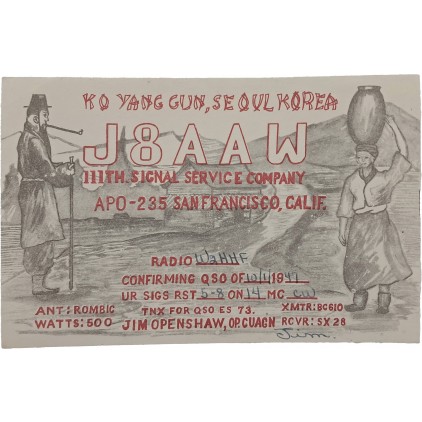 발신자는 미군 제111 통신중대(111th Signal Service Company) 소속으로, 콜사인 J8AAW를 사용하여 교신을 수행하였으며, 본 카드는 해당 교신(QSO)의 확인을 위해 발행된 것이다. 특히 본 자료는 APO-235(San Francisco) 주소 체계를 통해 미군의 해외주둔 통신망과 본토 간 연결구조를 보여주며, 안테나 형태(Rombic), 출력(500W), 송수신 장비(BC610, SX28) 등 구체적인 통신장비 정보가 함께 기록되어 있어 당시 군 통신운용의 기술적 수준까지 확인할 수 있는 점이 특징이다. 또한 화면에는 조선인의 복식과 생활상을 묘사한 삽화가 삽입되어 있어, 미군이 인식한 한국의 이미지와 문화적 표상이 함께 반영되어 있다.