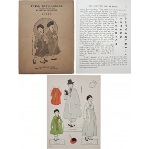 이 세트는 ‘Korean Twins’로 설정된 김(Kim)과 진추(Chin Chu)를 중심으로, 조선의 가옥, 가족 구성원, 혼례행렬, 학교 소녀, 기독교 신사 등 다양한 생활 장면을 종이인형 형태로 구현하고 있다. 인물과 배경은 모두 한복 차림의 조선인으로 묘사되어 있으며, 이는 당시 미국 선교 교육에서 조선을 독립된 문화권으로 인식하고 있음을 시각적으로 보여준다. 특히 혼례행렬과 가옥구조, 의복구성, 생활도구 등이 세밀하게 묘사되어 있어 1920년대 조선의 민속 생활상을 어린이 교육용 매체로 번안한 사례임이 확인된다. 본 인형들은 단순한 놀이용이 아니라, 서양식 기독교 가치와 근대적 생활규범을 이야기와 함께 체험하도록 설계된 교육 교구라는 점에서 명확한 목적성을 지닌다.