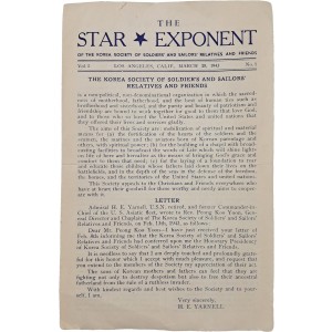 이 자료는 1943년 3월 25일 미국 로스앤젤레스에서 '한국 장병 친우회(The Korea Society of Soldiers' and Sailors' Relatives and Friends)가 발행한 기관지 『THE STAR EXPONENT』의 창간호(Vol. 1, No. 1)다.