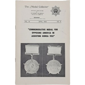 본 자료는 미국 Orders and Medals Society of America(OMSA)에서 발행한 공식 학술지 [The Medal Collector] 1965년 4월호로, 전 세계 훈장·메달 수집가 및 연구자를 대상으로 제작된 전문 간행물이다. 해당 호에는 “Commemorative Medal for Opposing America in Assisting Korea 1951”이라는 제목의 글이 수록되어 있으며, 한국전쟁 당시 중국 측에서 제작된 반미·참전 기념 메달을 다룬 매우 이례적인 내용이 포함되어 있다.
