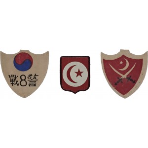 터키군 패치 2점 중 한 점에는 “Worn by Turkish unit in Korea (United Nations forces)”라는 영문 라벨이 동반되어 있어, 한국전쟁 참전 유엔군 터키 부대에서 실제 착용·사용된 패치임을 보여준다. 펠트 재질과 제작방식은 전시기 또는 전후 초기 군사 패치의 특징을 따른다.