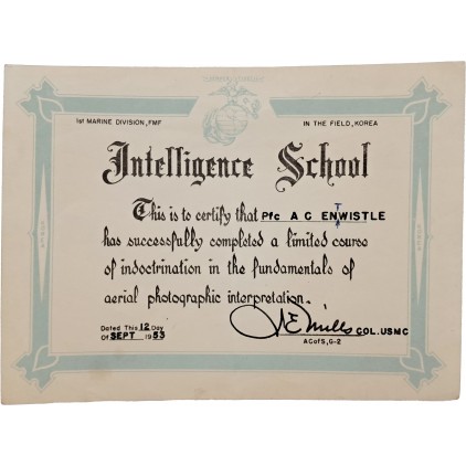 본 증서는 한국전쟁 정전 직후인 1953년 9월 12일, 미 해병대 제1해병사단(1st Marine Division, FMF) 소속 병사 A. C. Enwistle(Pfc., 일병)에게 발급된 Intelligence School 수료 증서이다.